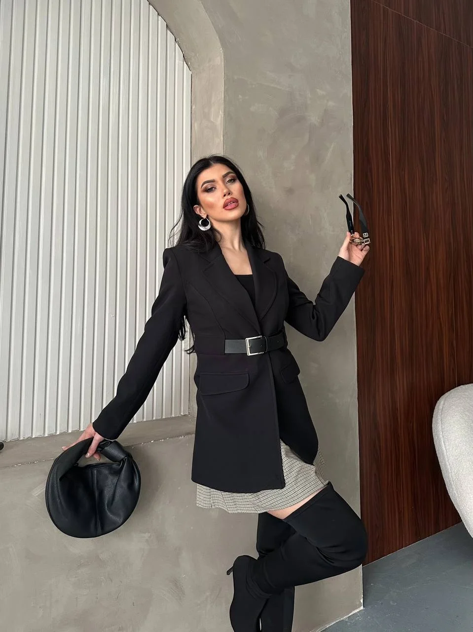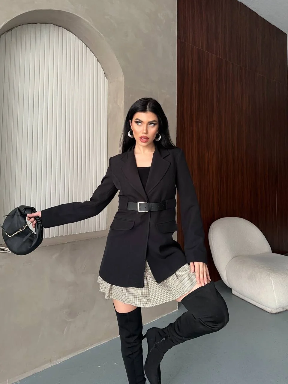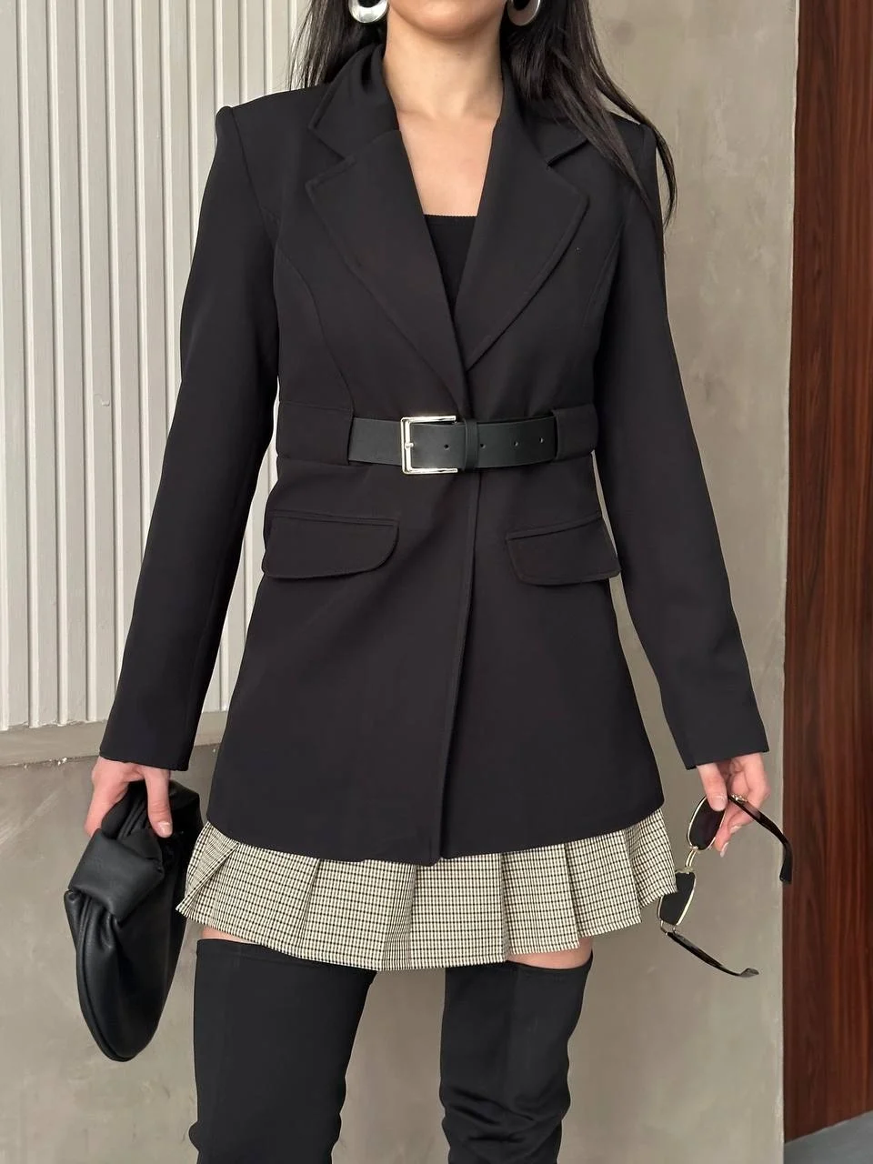 Siyah Belden Kemerli Blazer Ceket Elbise | Premium Seri