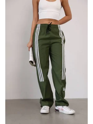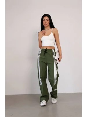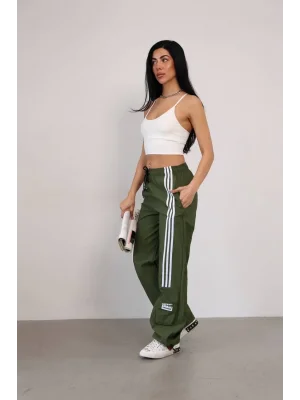 Modaskop Paraşüt Eşofman: Rahatlığı ve şıklığı bir arada sunan krem renkli eşofman altı, önden üç şerit detayı ve paça cebiyle dikkat çekiyor.