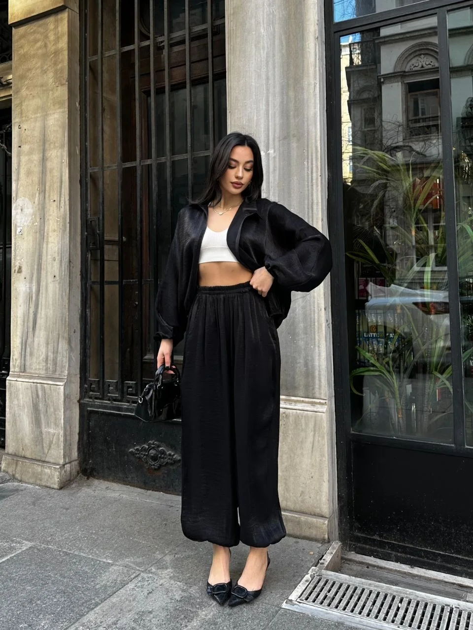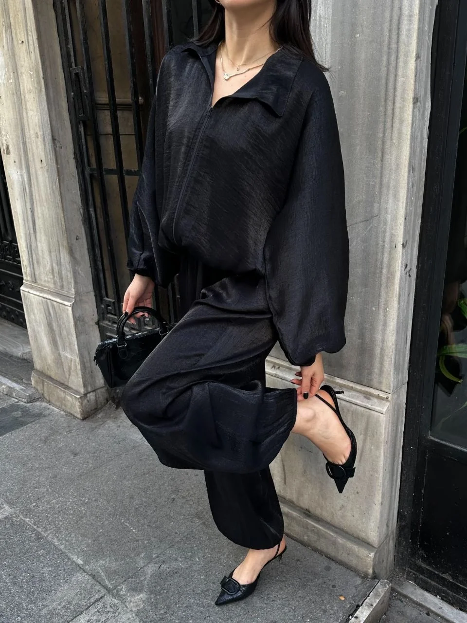 Siyah Şık Saten İkili Takım - Bomber Ceket + Bol Paça Pantolon