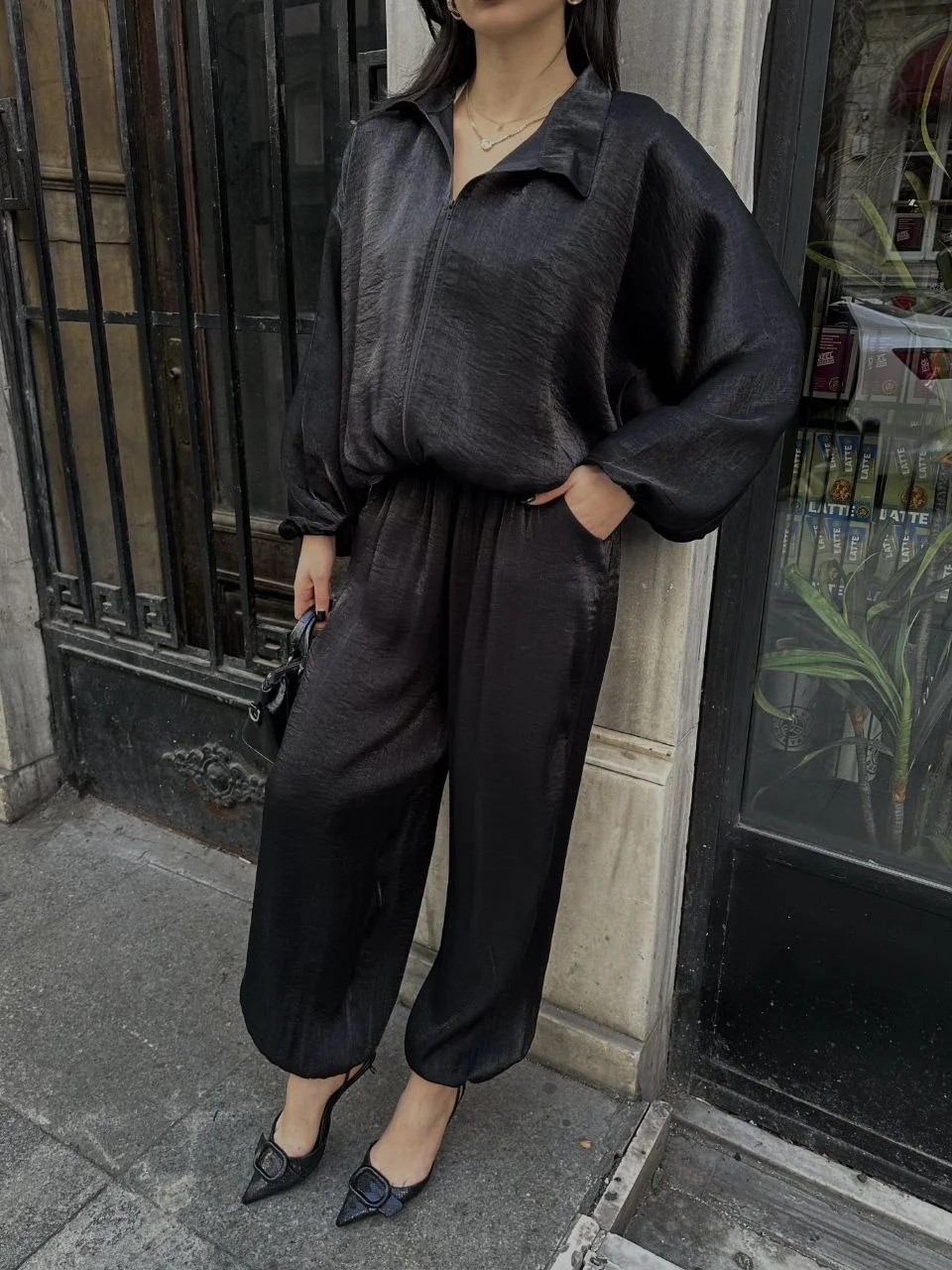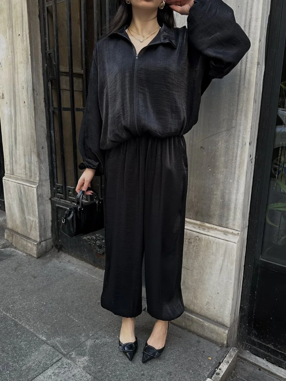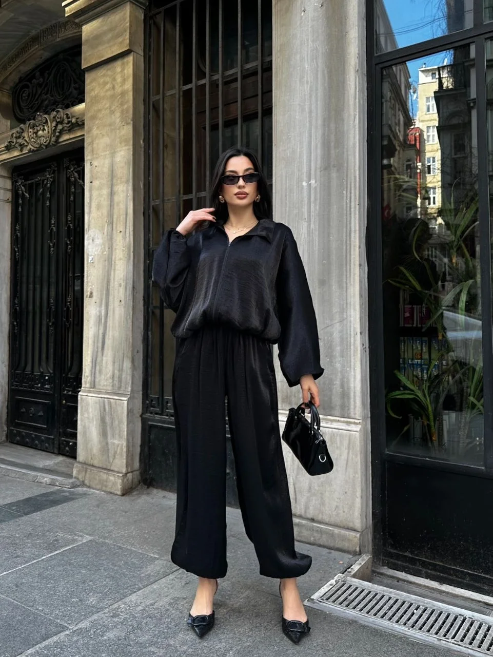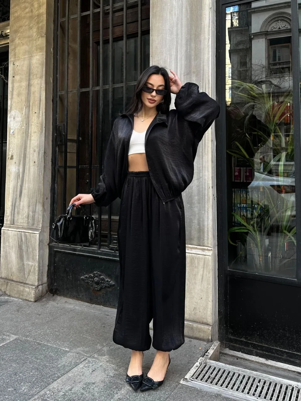 • Siyah Şık Saten İkili Takım - Bomber Ceket + Bol Paça Pantolon