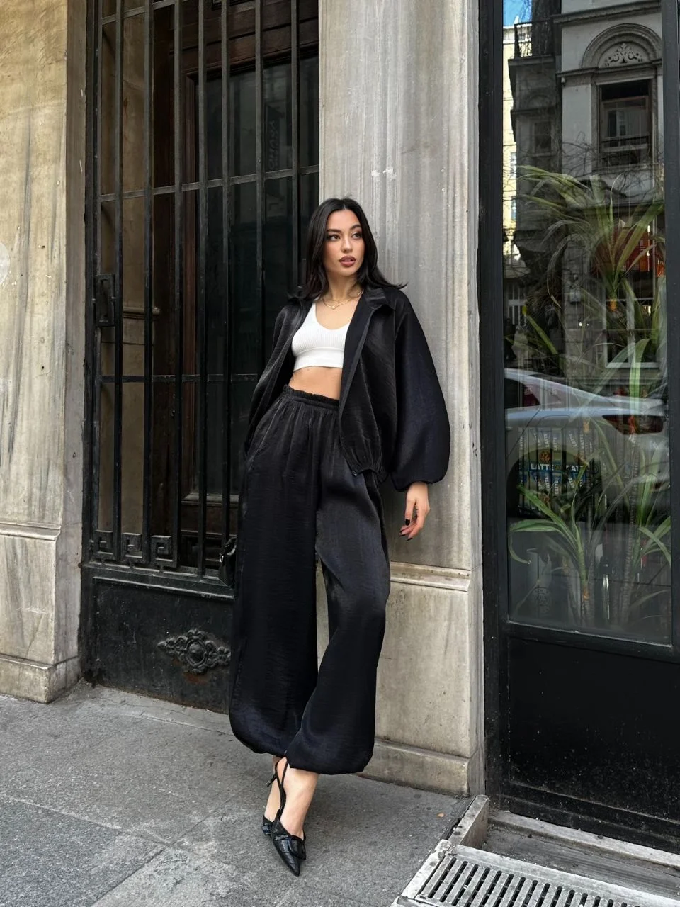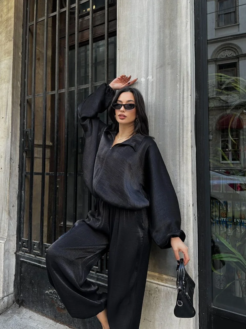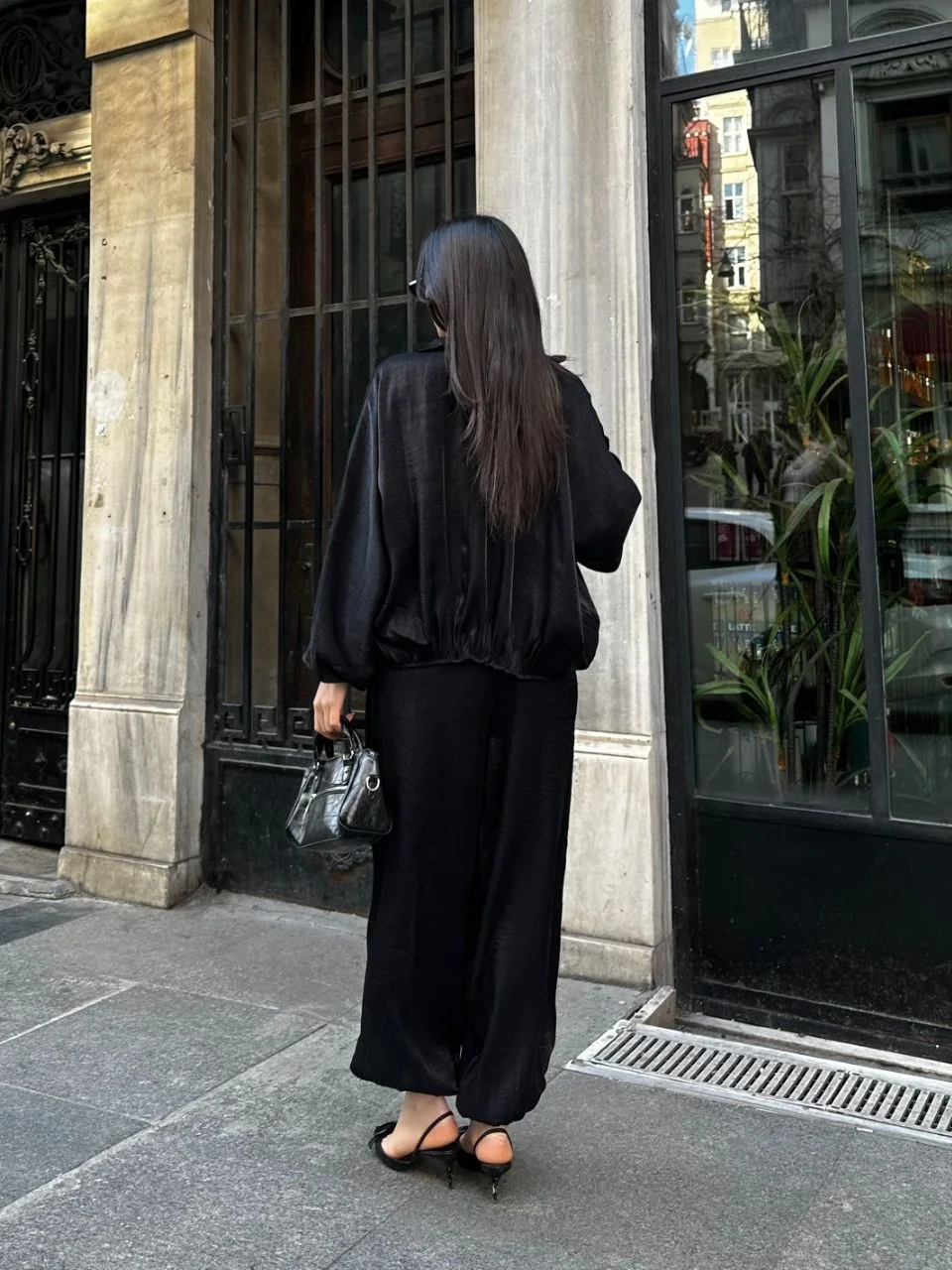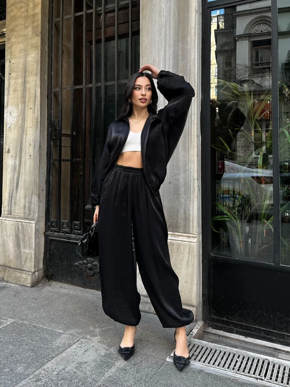 • Siyah Şık Saten İkili Takım - Bomber Ceket + Bol Paça Pantolon
