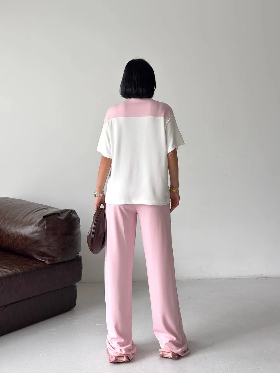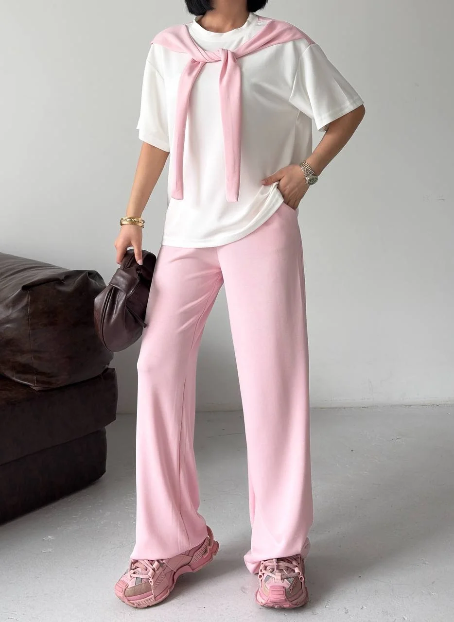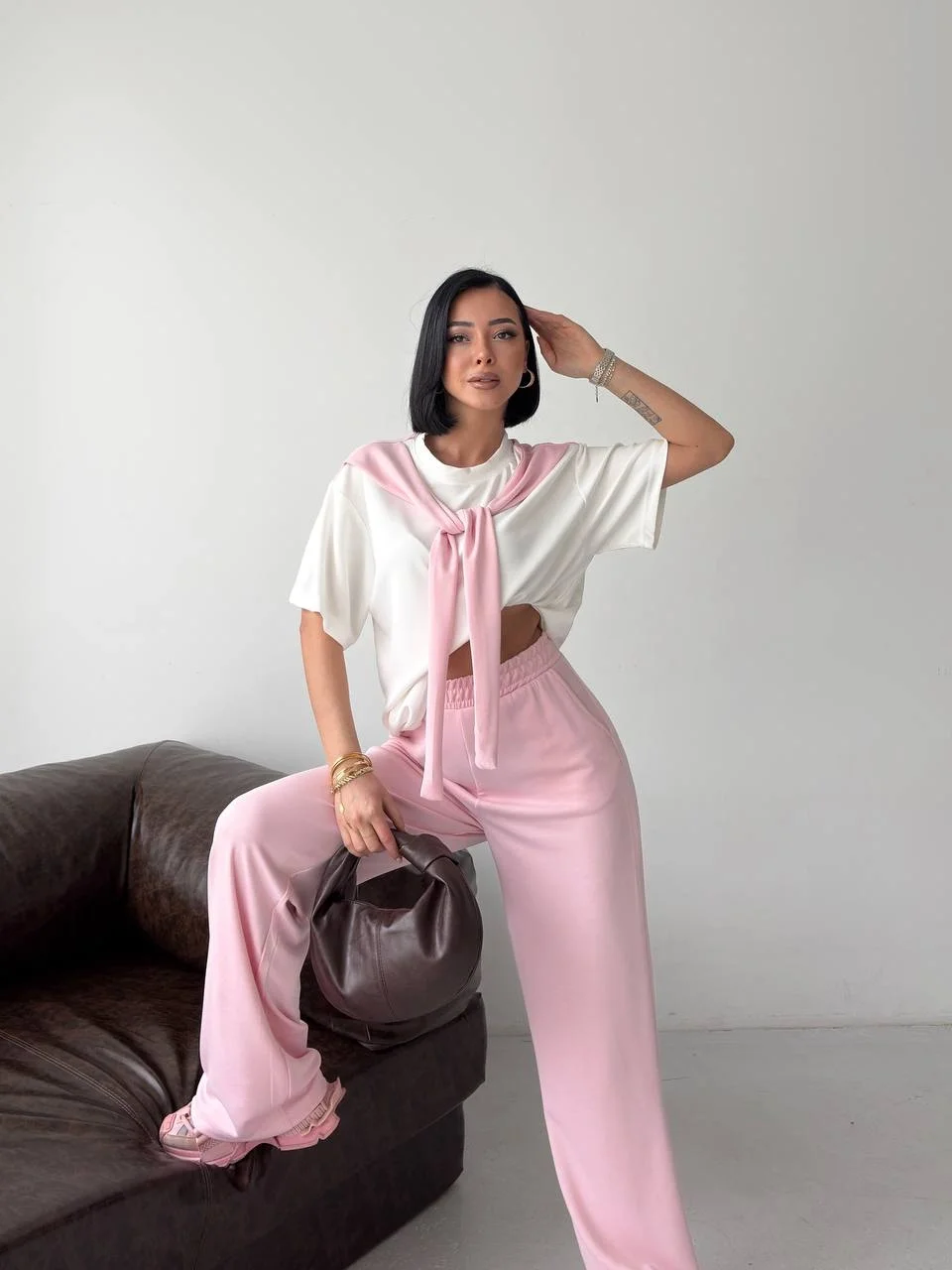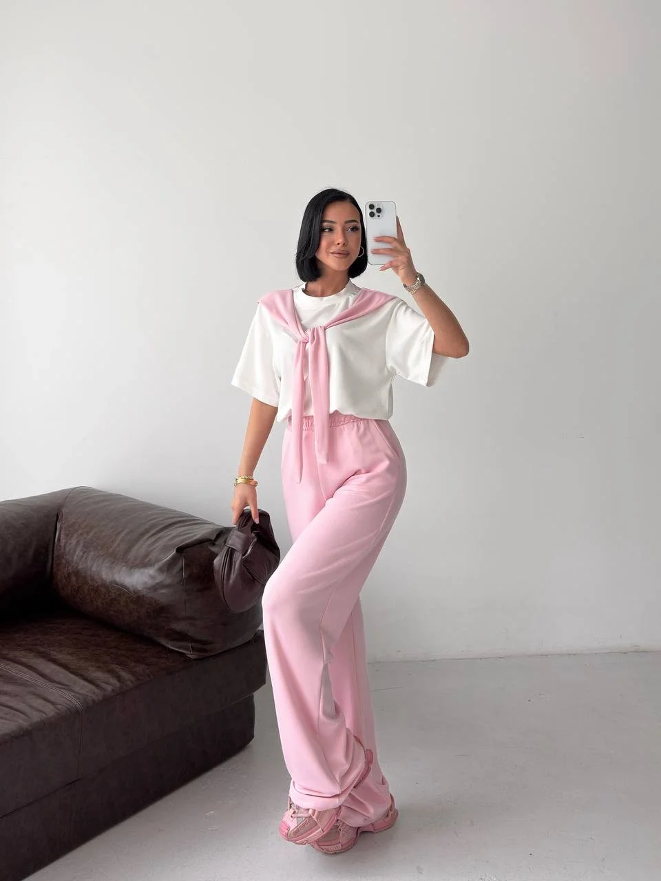 Soft Pembe Rahat Takım – Basic Tişört & Yüksek Bel Salaş Pantolon Kombini