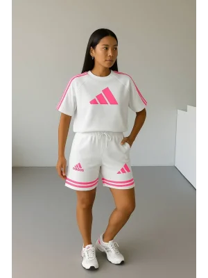 Beyaz ADD Fuşya Çizgili Oversize Unisex Şortlu Takım