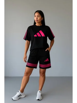 Siyah ADD Fuşya Çizgili Oversize Unisex Şortlu Takım