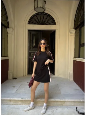 Siyah Alo Çizgili Ribana Şort Etekli Takım