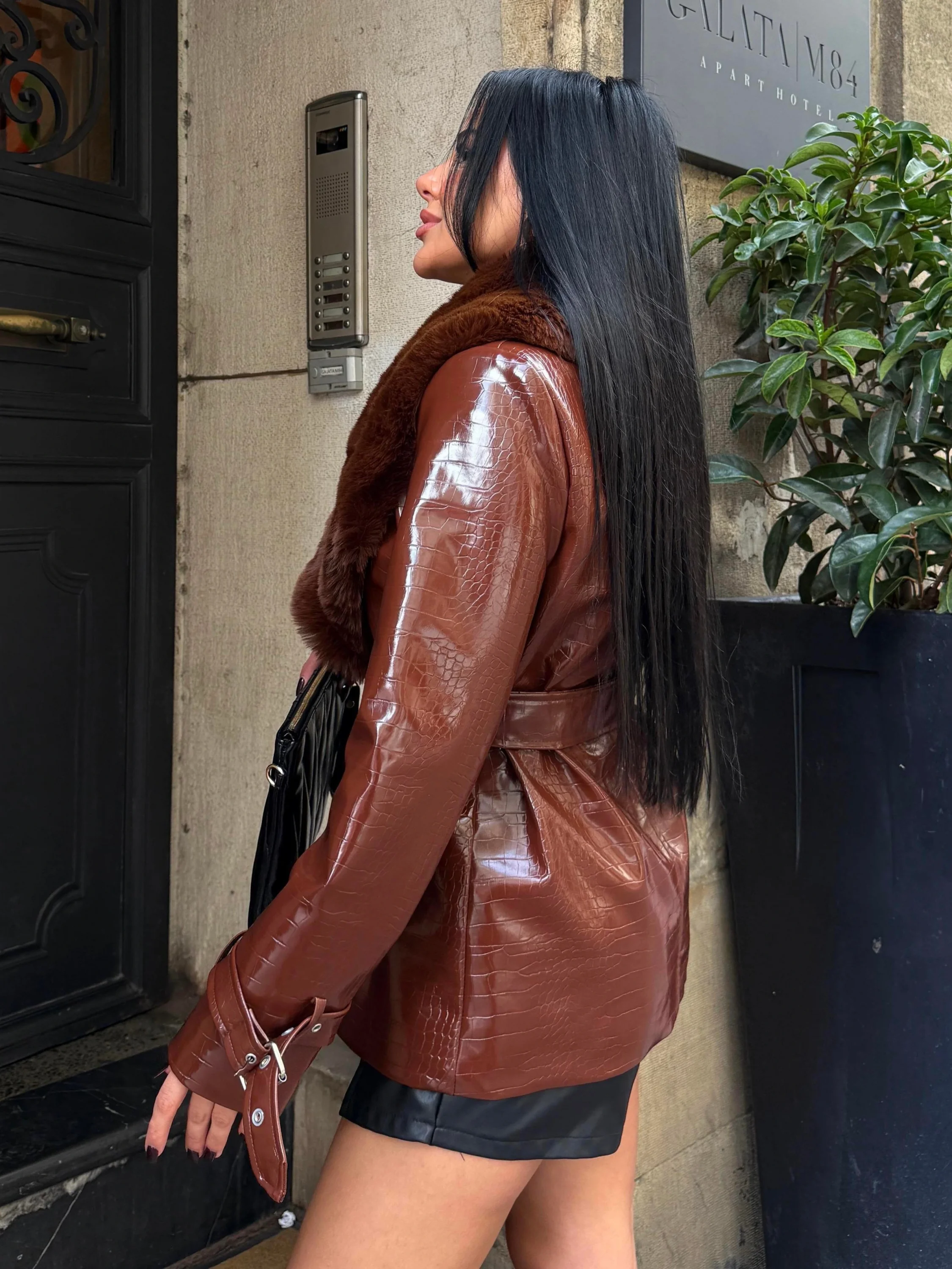 • Taba Deri Antonia Kürk Yaka Kısa Kaban
