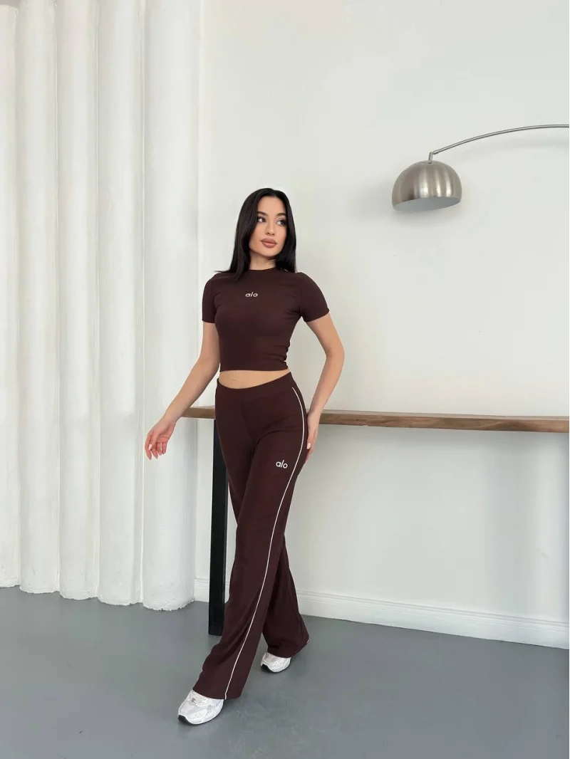 Kahve Yüksek Bel Çift Bantlı Flare Tayt Takımı