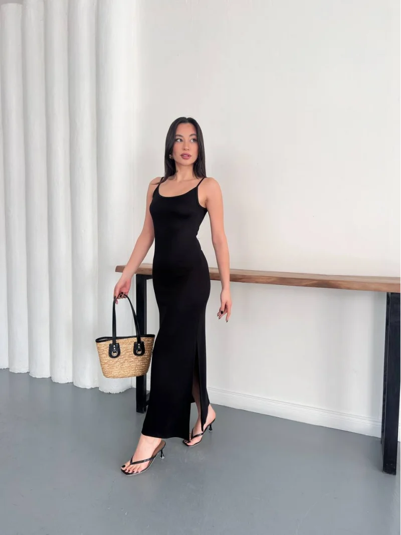 Siyah Ayarlanabilir İp Askılı Pike Uzun Elbise