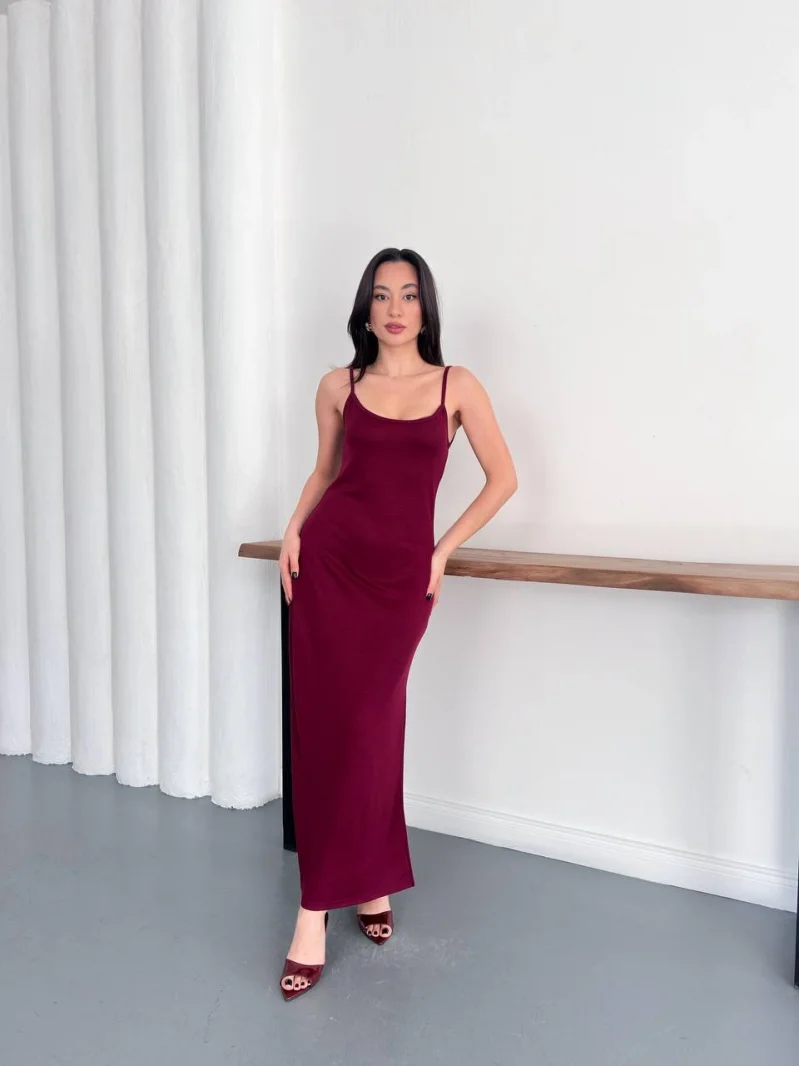 Bordo Ayarlanabilir İp Askılı Pike Uzun Elbise