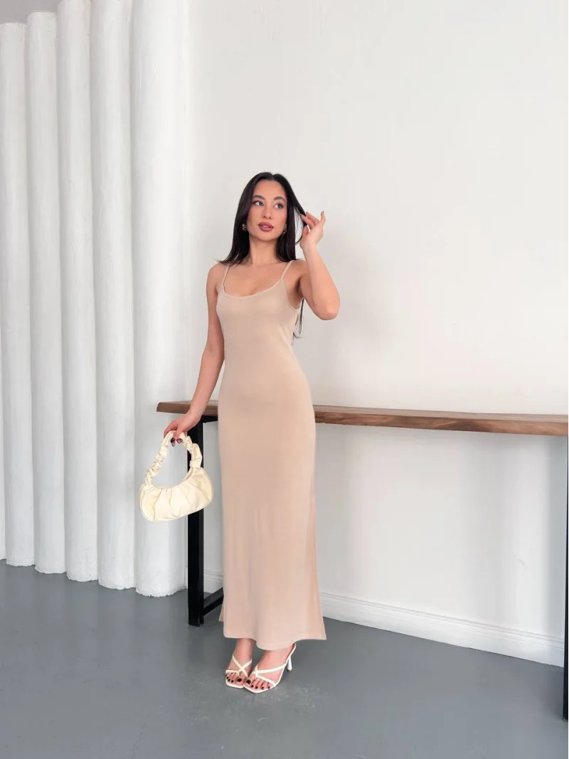 Bej Ayarlanabilir İp Askılı Pike Uzun Elbise