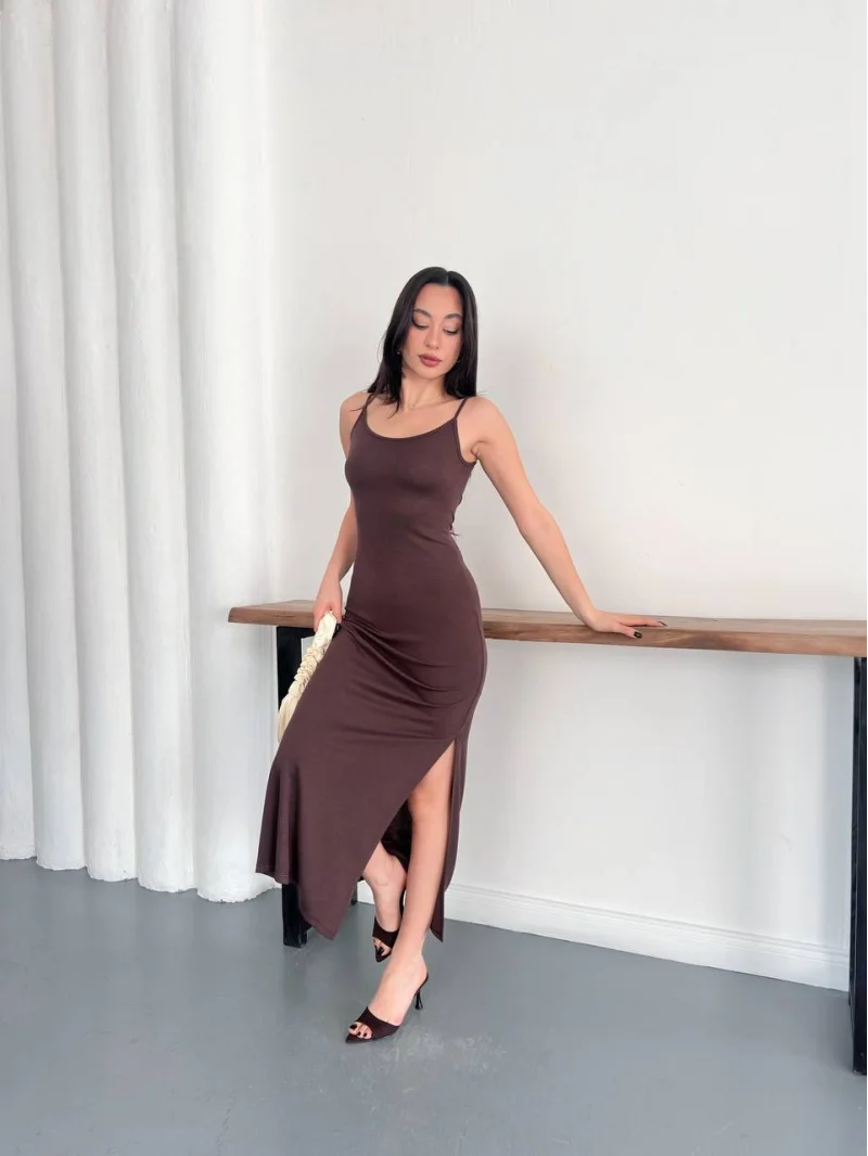 Kahve Ayarlanabilir İp Askılı Pike Uzun Elbise