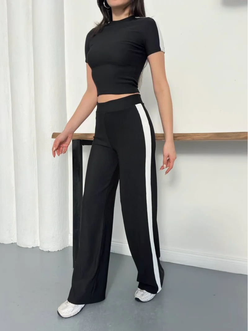 Siyah Yan Şerit Detaylı Yüksek Bel Bol Paça Tayt Takım