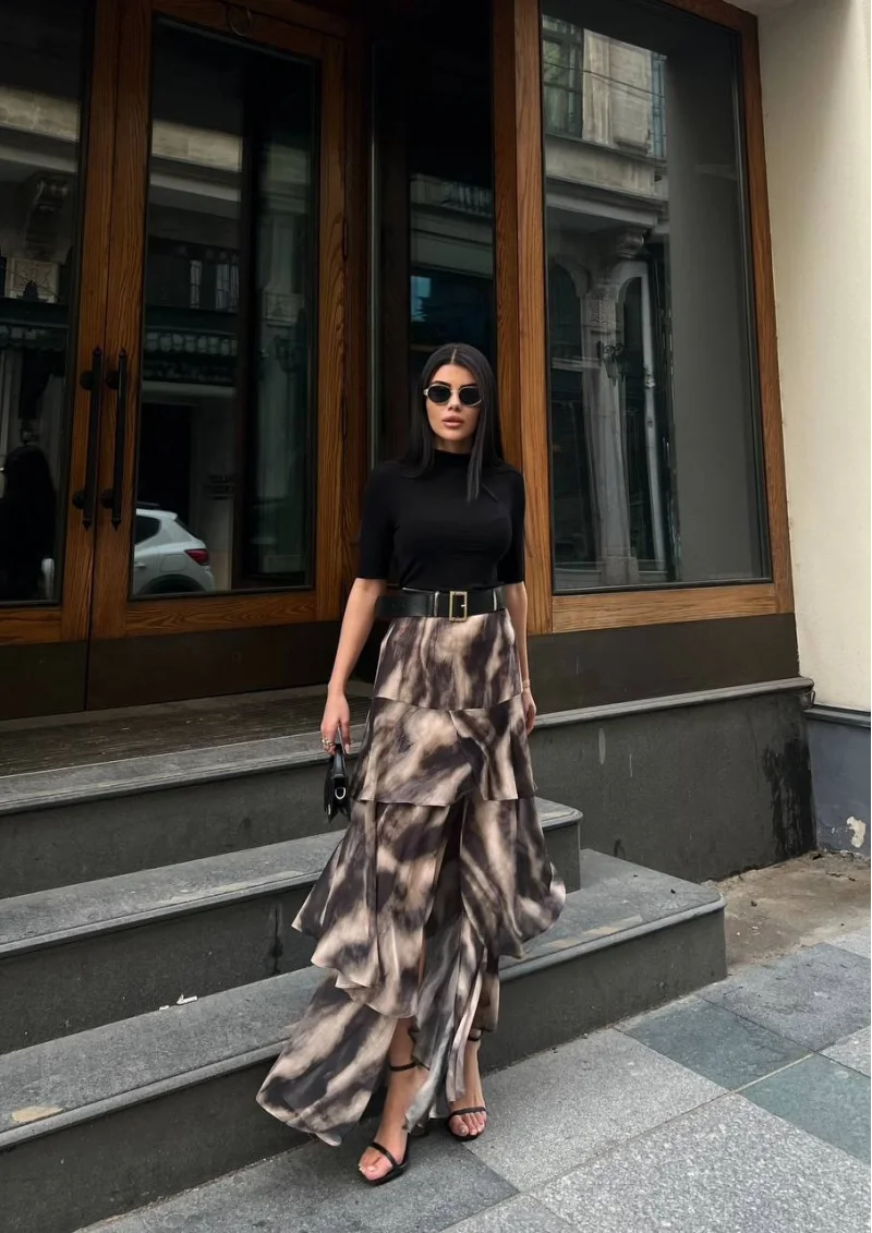İthal Özel Tasarım Transparan Desenli Asimetrik Elbise