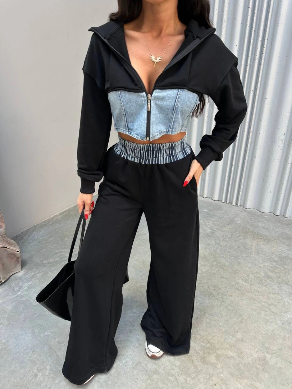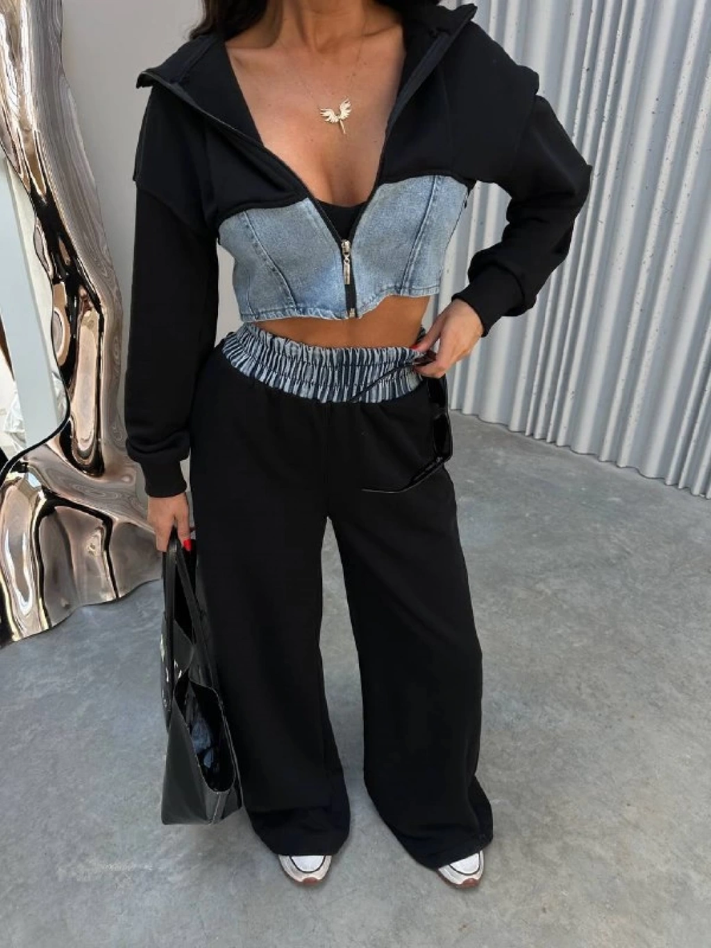 Pudra İki İplik Paça Nakışlı İkili Takım