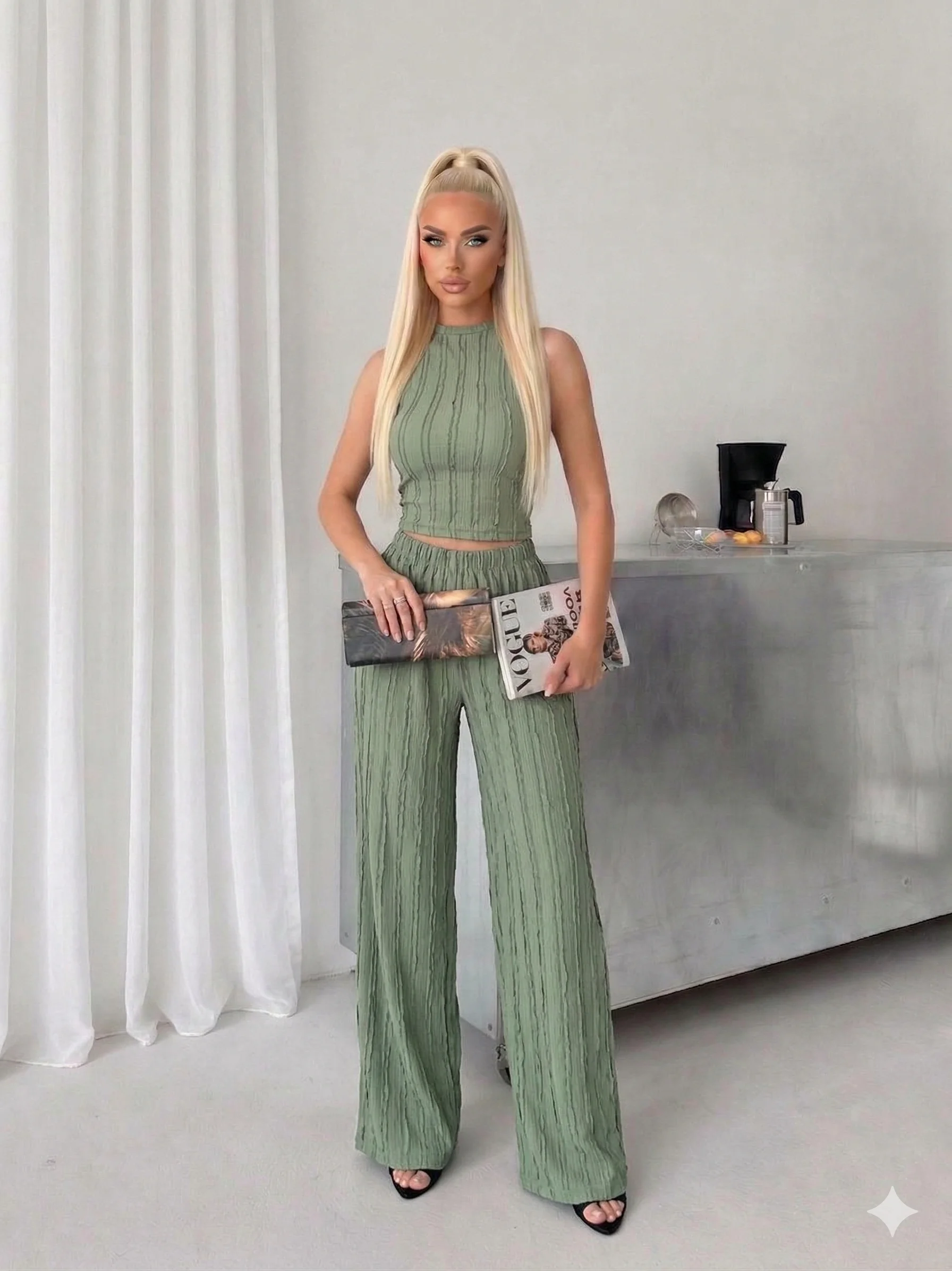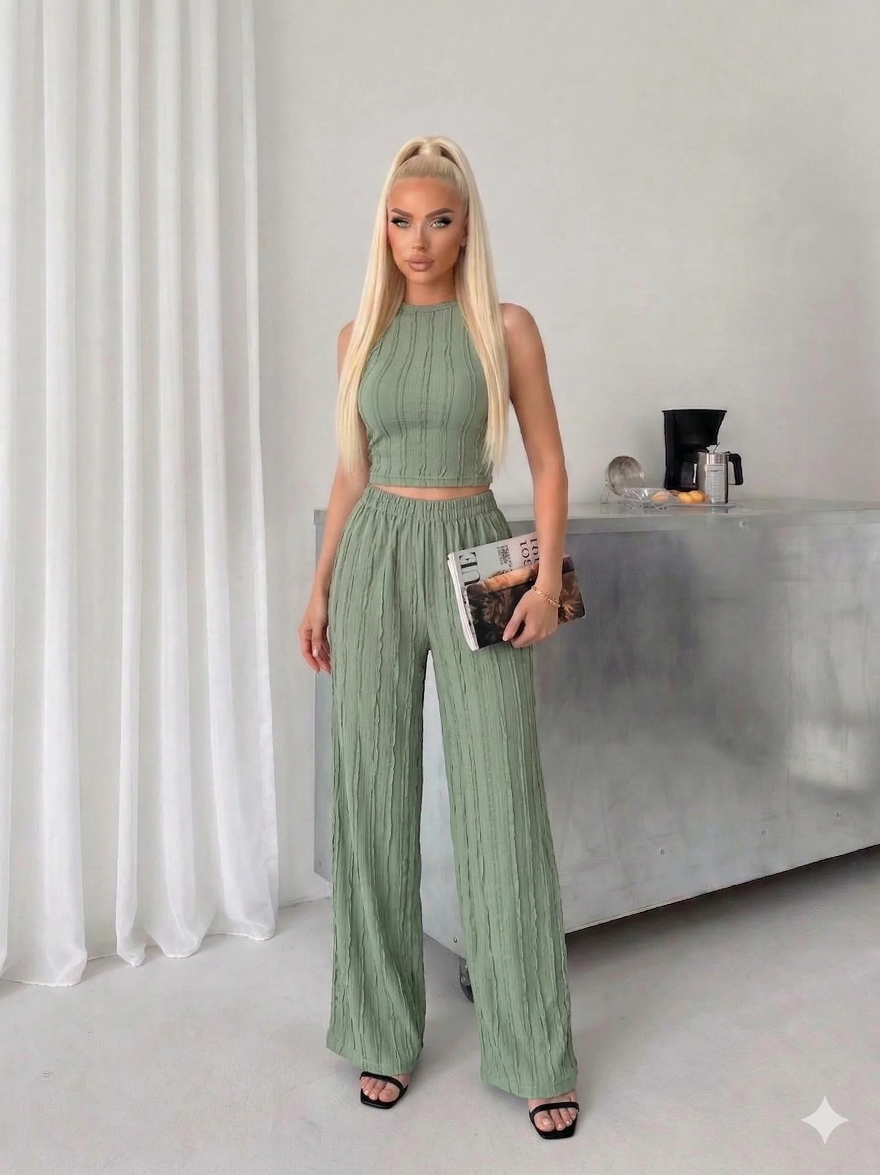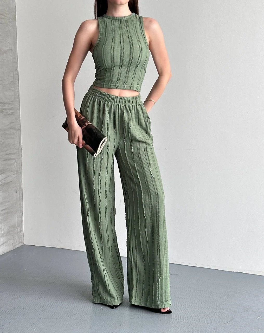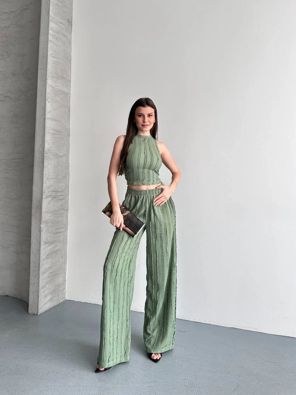 • Yeşil Krinkıl Kumaş Crop Top & Palazzo Pantolon İkili Takım - Yaz Şıklığı