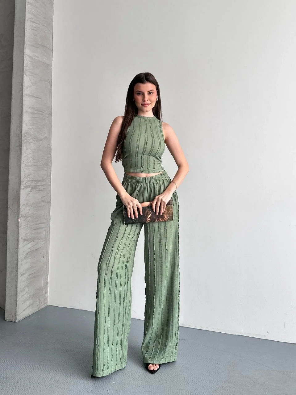 Yeşil Krinkıl Kumaş Crop Top & Palazzo Pantolon İkili Takım - Yaz Şıklığı