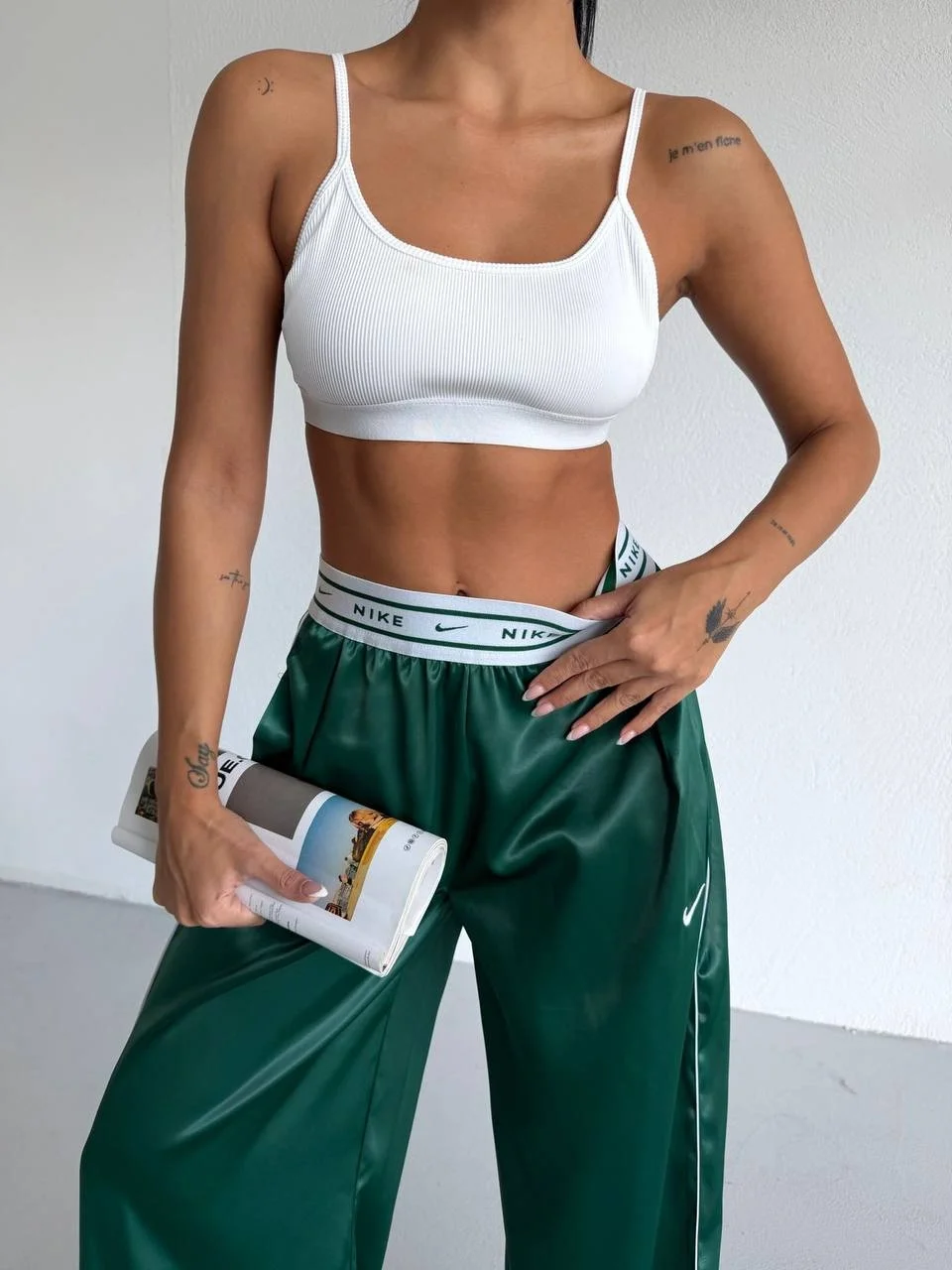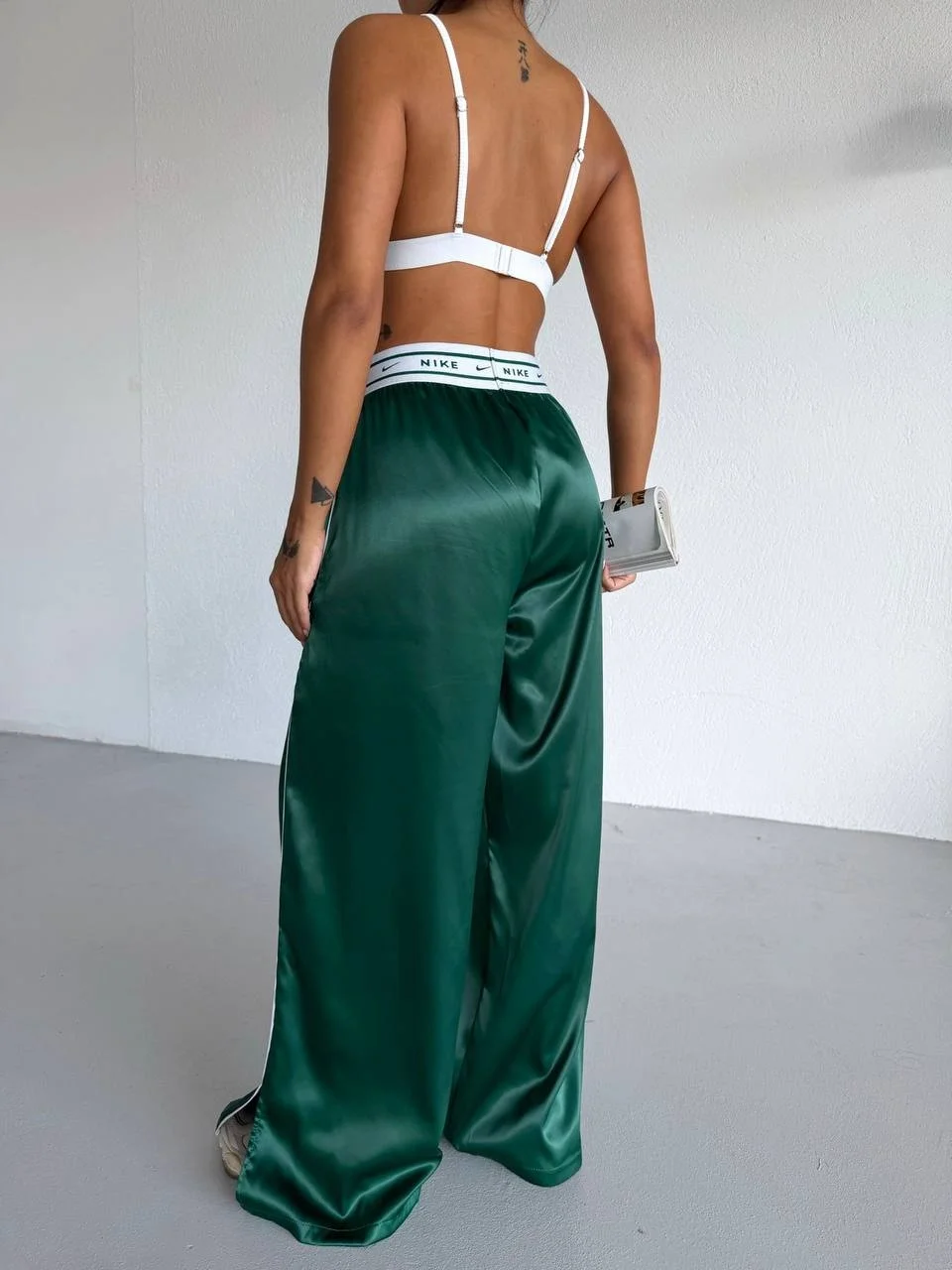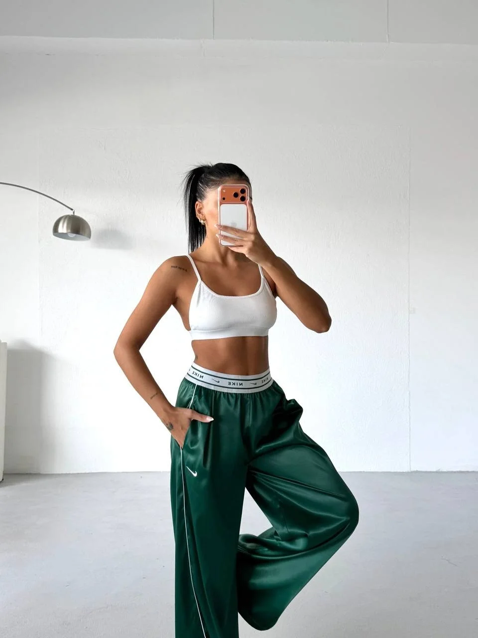 Yeşil Yüksek Bel Parlak Oversize Eşofman Altı – Rahat Kesim Şık Spor Stil