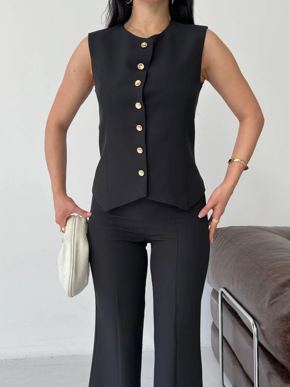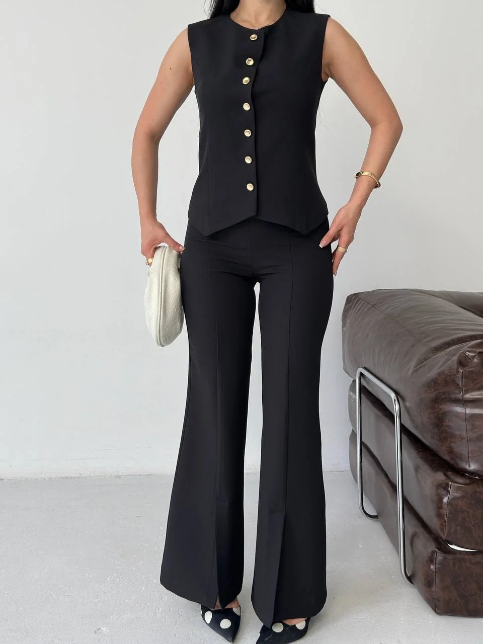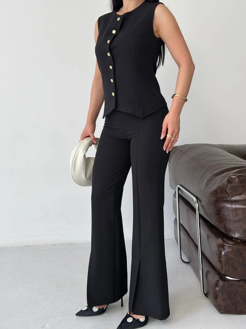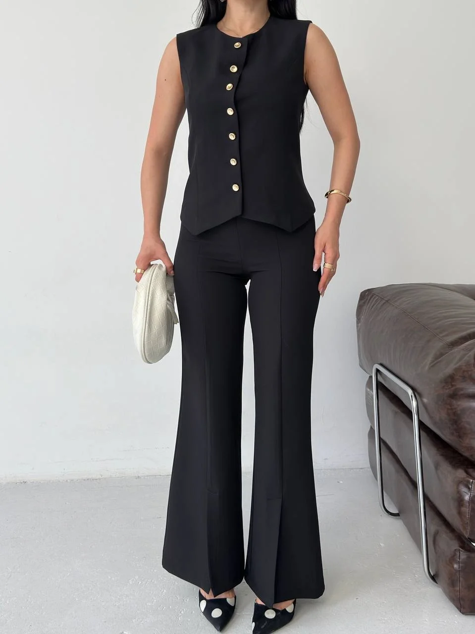 Zarif Siyah Takım – Modern Kesim Yelek & İspanyol Paça Pantolon Kombin