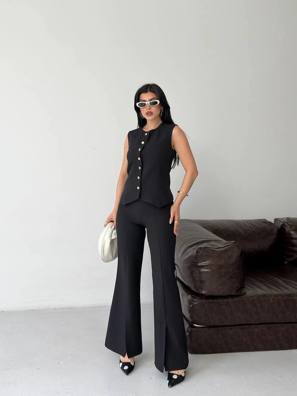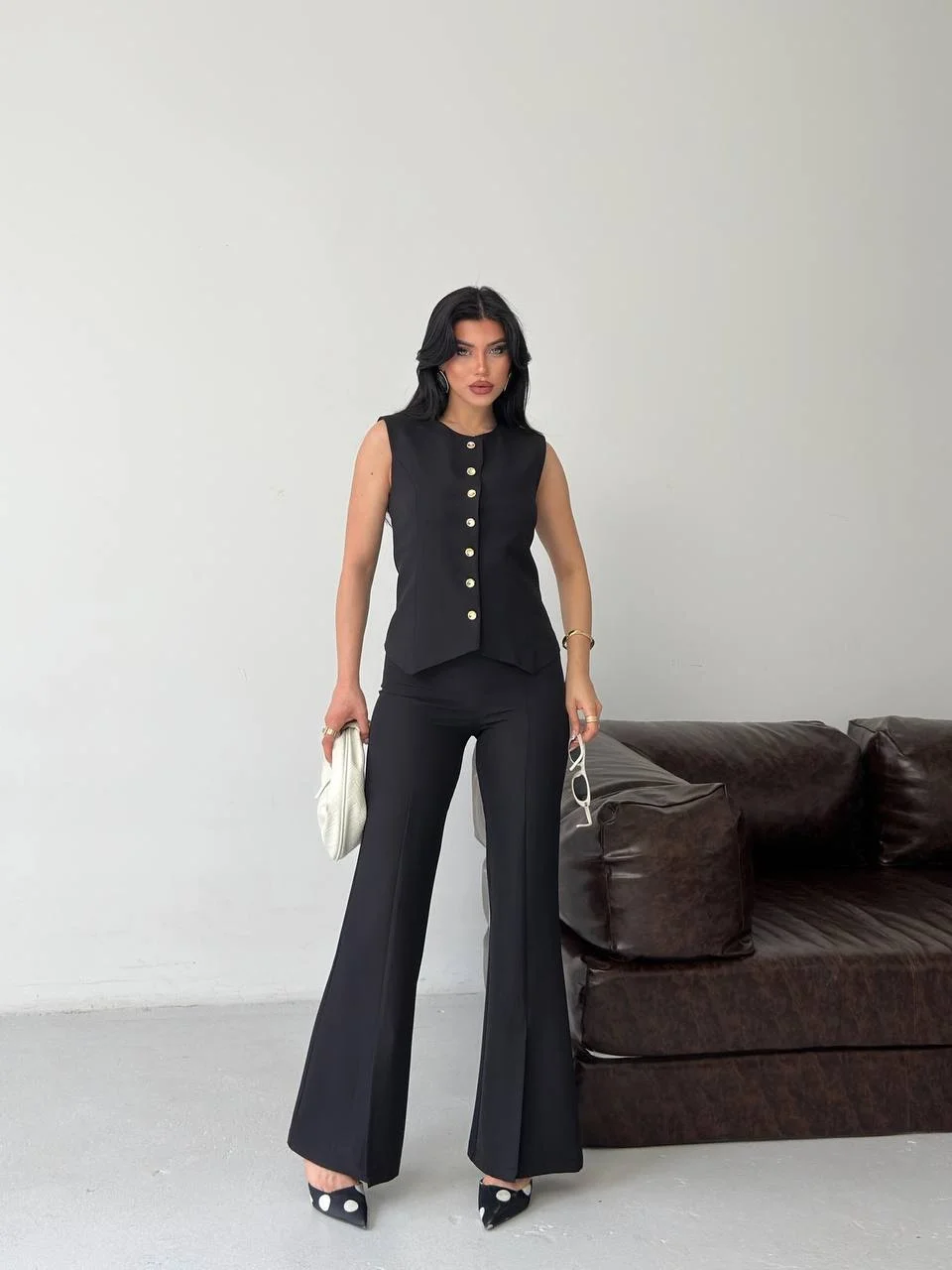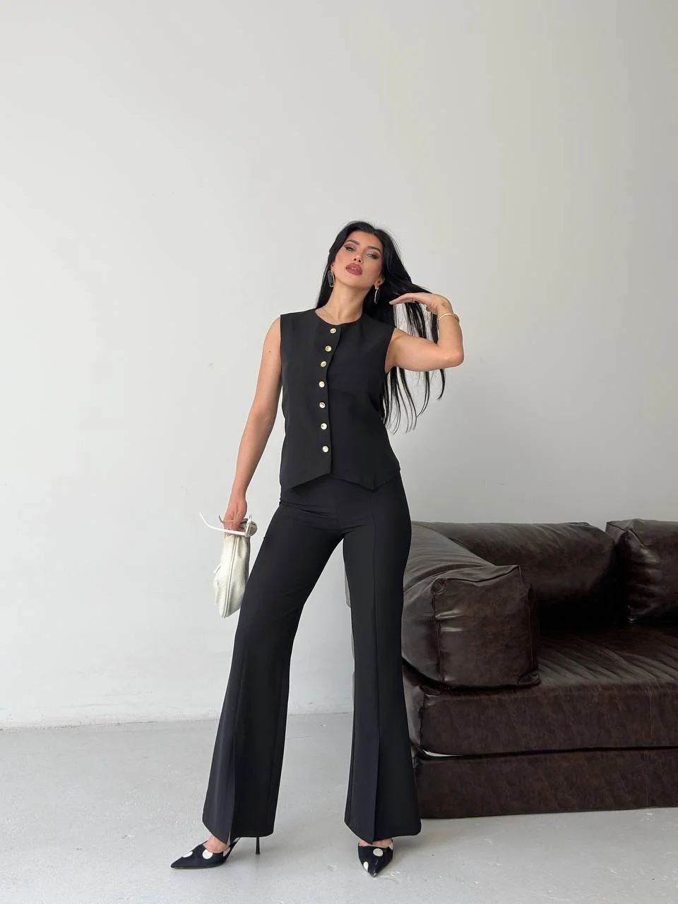 • Zarif Siyah Takım – Modern Kesim Yelek & İspanyol Paça Pantolon Kombin